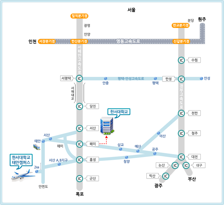 | 철도안내 | - 장항선 : 서울역에서 삽교역까지 2시간소요 - 삽교역에서 본 대학 통학버스가 운행됩니다.(20분소요) | | 버스노선안내 | - 서울지역 남부터미널에서 직행운행 - 서울주요지역에서 학교까지 노선별 통학버스 운행(약70~90분소요) | | 도로안내 | - 서해안고속도로 개통으로 서울, 인천지역(서서울 인터체인지)에서 학교 앞까지 약 1시간대 통학가능) |  -